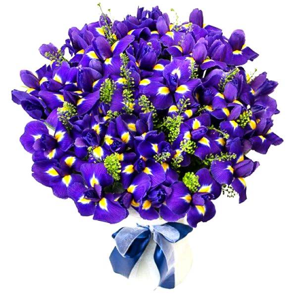 Этот букет – яркий пример внушительного вида ирисов. 51 темно-синий цветок выглядит очень презентабельно. Между ирисами в букете проглядывается зелень, которая придает композиции свежести и сближает с природой. Ирисы подходят для подарка членам семьи или важному в жизни мужчине, выражают доверие, искренность и дружбу и оставят незабываемый след в памяти.