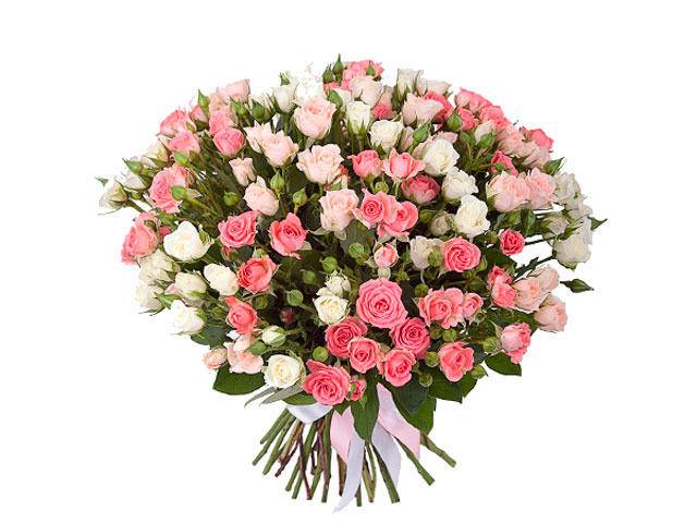 Композиция состоит из кустовых роз белого и розового оттенков. Розовые розы издавна считаются символом искренних чувств, расположенности и надежды на удачное и стремительное развитие отношений. В то же время, белые цветы символизируют чистоту и искренность. Букет уместен не только для подарка любимой девушке, но и как презент близким друзьям.